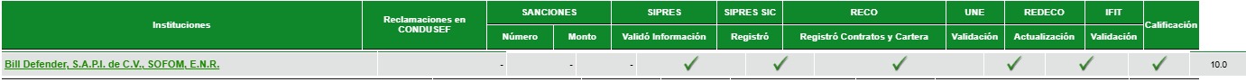 La información corresponde únicamente a Bill Defender, S.A.P.I. de C.V., SOFOM, E.N.R. (“Impacto ASG”); para conocer la información de todo el sector, puedes acceder al sitio http://www.buro.gob.mx.